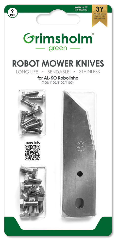 9 st knivar och 9+9 st skruvar för AL-KO Robolinho (100, 1000 m.fl).Knivarna från Grimsholm för AL-KO är tillverkade i rostfritt stål och har optimerats för bästa tänkbara balans mellan hållfasthet, skärpa och slittålighet för optimalt klippresultat.Den noggrant kontrollerade härdningsprocessen gör att kniven behåller sin flexibilitet för att i största möjliga mån undvika avbrutna knivar i gräsmattan om gräsklipparen skulle köra på en sten eller annat hårt föremål.Denna förpackning innehåller 9 knivar och 9 skruvar vardera av två storlekar för att passa till både gamla typens knivdisk (M3) som den nyare (M4). Knivarna och skruvarna är placerade i separata behållare som enkelt öppnas på baksidan av förpackningen där behållarna är perforerade.Passar:Robolinho 110Robolinho 1100Robolinho 3100Robolinho 4100